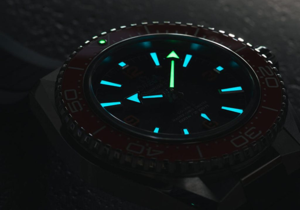 Speaking of lume, as has become standard for Omega divers, the markers and hour hand glow blue, while the minute hand and bezel pip have a matching green tone. You’ll also notice a distinct lack of a date window (something we’ve only seen in the Ultra Deep models).